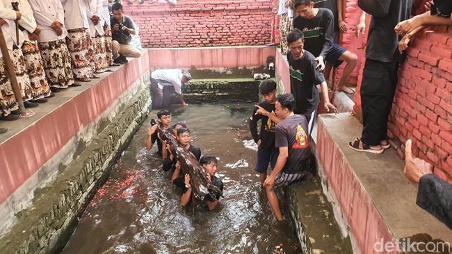 Proses ritual dilanjut dengan memandikan kayu keramat menggunakan air kembang dan kemenyan. Usai dimandikan, kayu tersebut dikafani dan diletakkan kembali ke balong keramat.