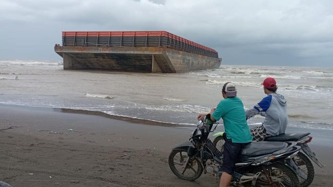 Sebuah tongkang pengangkut batu bara terdampar di Pantai Tiris, Kabupaten Indramayu. Tongkang terseret ombak tinggi empat meter usai kapal tunda mengalami gangguan mesin.