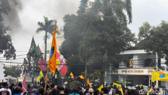 Mahasiswa Cirebon kembali menggelar aksi demonstrasi di depan gedung DPRD Kota Cirebon, Jumat (21/8/2025). Tampak, asap hitam yang berasal dari bakaran ban para demonstran membubung tinggi. Massa aksi yang Indonesia Cemas ini membawa poster berisi sejumlah tuntutan.