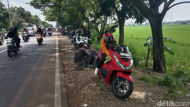 Warga Purwokerto tersebut bersiap istirahat dari lelahnya perjalanan mudik sedari Tangerang. Ia memarkirkan sepeda motor matic-nya di tepi bahu jalan. Sementara, istrinya sibuk menggelar jas hujan yang kemudian ia gunakan untuk beristirahat.