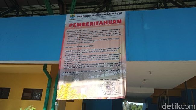 Pantauan detikJabar pada Senin (28/4/2025), tepat pada bagian depan stadion Bima, terpampang sebuah pemberitahuan yang dikeluarkan oleh Badan Pengelola Keuangan dan Pendapatan Daerah (BPKPD) Kota Cirebon.