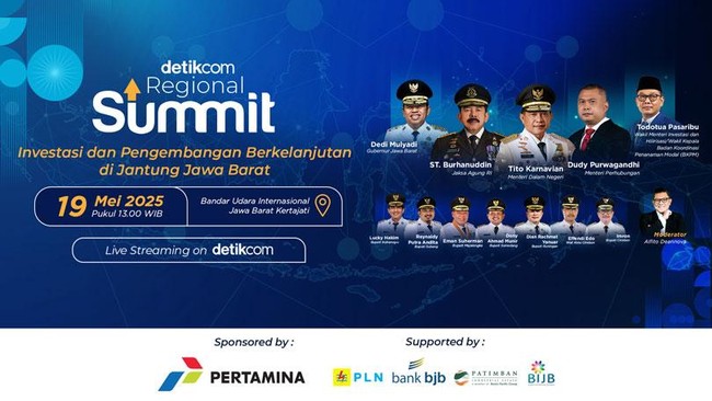 Diskusi yang melibatkan para menteri dan kepala daerah ini mengusung tema 'Investasi dan Pengembangan Berkelanjutan di Jantung Jawa Barat'. Sejumlah menteri menjadi pembicara di detikcom Regional Summit, di antaranya Menteri Dalam Negeri Tito Karnavian, Wakil Menteri Investasi Todotua Pasaribu, dan Menteri Perhubungan Dudy Purwagandhi dan Gubernur Jabar Dedi Mulyadi.