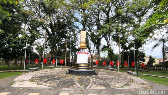 Kemudian di bagian tengah, ada tugu Adipura. Bagian belakangnya ada bangku panjang dengan latar tulisan 'Taman Pandapa'.