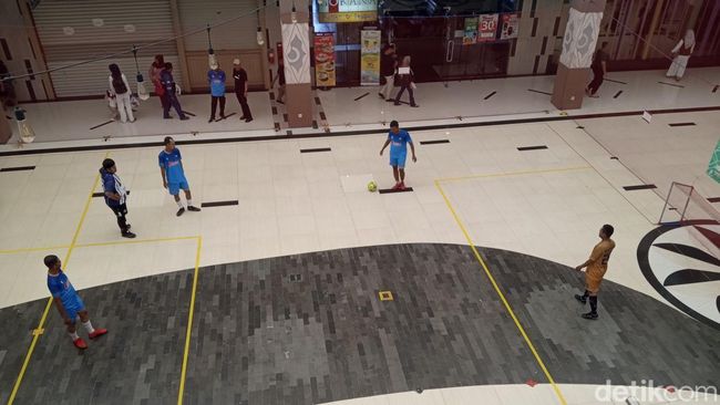 Di lapangan tersebut, pertandingan seru tengah berlangsung. Para pemain tampil dengan penuh semangat, layaknya sedang berlaga di stadion sungguhan meski lapangannya berada di tengah-tengah area mal.
