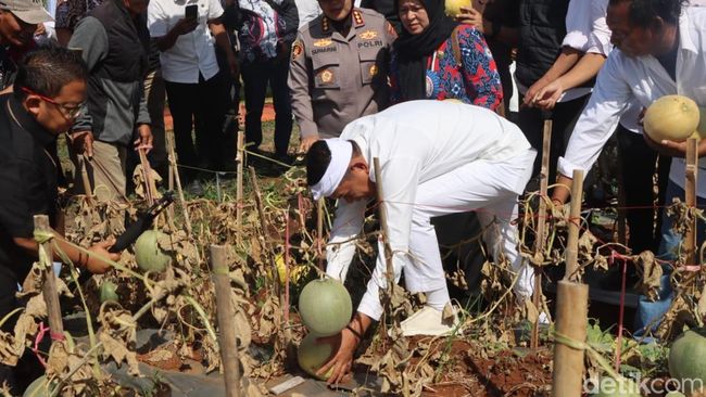 Gubernur Jawa Barat Dedi Mulyadi ikut turun langsung dalam panen raya buah melon di lahan warga seluas 1,3 hektare di Desa Ciawijapura, Kecamatan Susukanlebak, Kabupaten Cirebon, Kamis (26/6/2025).