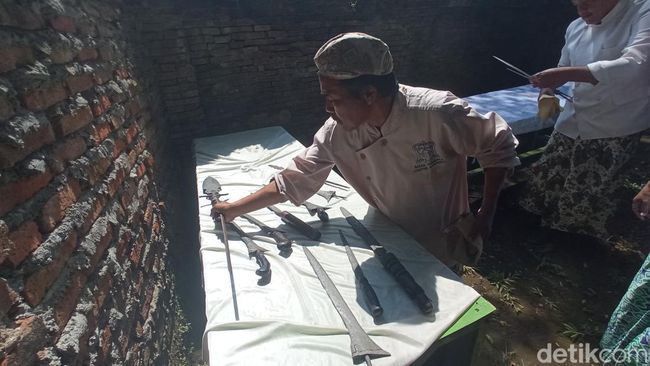 Di tempat itu, beberapa abdi dalem dengan busana khas keraton tampak khusyuk duduk bersila, tangan mereka perlahan mengusap bilah-bilah pusaka dengan air kembang. Di antara mereka, hadir pula anggota keluarga keraton yang turut larut dalam suasana khidmat.