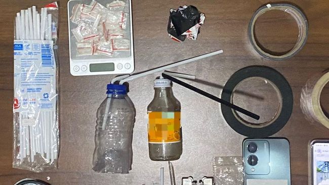 Tak hanya itu, berbagai macam peralatan juga ditemukan oleh petugas. Mulai dari alat hisap, timbangan digital, lakban, plastik klip, hingga gunting.