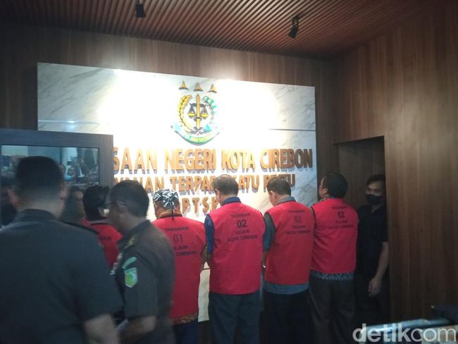 Kejari Kota Cirebon menetapkan enam tersangka dalam kasus korupsi pembangunan gedung Setda Kota Cirebon pada Rabu (7/8/2025). Mereka tampil dengan mengenakan rompi berwarna merah bertuliskan 'Tahanan Kejari Kota Cirebon'.