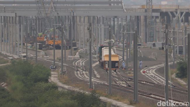 Bandung - #Foto Pembangunan Kereta Cepat Jakarta Bandung (KCJB) terus dikebut. Saat ini pemasangan rel KCJB tengah dilakukan di Depo Tegalluar, Kabupaten Bandung.