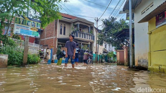 Bandung - Banjir kembali melanda kawasan Dayeuhkolot, Kabupaten Bandung. Akses lalu lintas warga pun tersendat karena genangan air cukup tinggi untuk dilalui kendaraan.