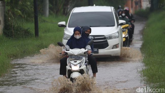 Bandung - Hujan yang mengguyur wilayah Kota Bandung dan Kabupaten Bandung membuat volume air di Sungai Cikeruh meluap ke jalan raya.