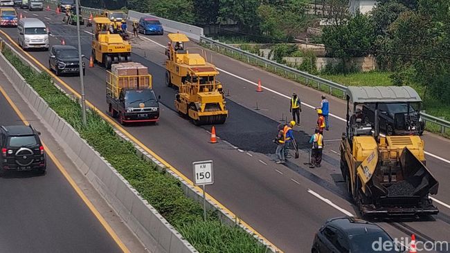 Bandung - Jelang mudik lebaran 2023, Jasa Marga lakukan perawatan scrapping filling overlay atau pengaspalan di ruas Jalan Tol Purbaleunyi KM 147.