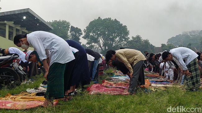 Cimahi - Jemaah Muhammadiyah melaksanakan Salat Idulfitri di Lapangan Rajawali, Kita Cimahi pada Jumat (21/4/2023). Jemaah pun khusyuk menunaikan salat hari raya.