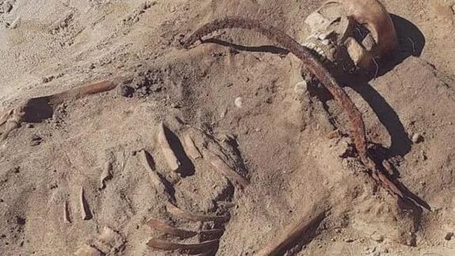 Sisa-sisa "vampir" perempuan, disematkan ke tanah dengan sabit di tenggorokannya untuk mencegahnya kembali dari kematian, ditemukan selama pekerjaan arkeologi di pemakaman abad ke-17 di desa Pien di Polandia. Foto: Twitter/creepy_org