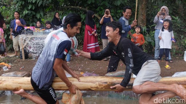 Bandung - Keceriaan mewarnai warga Kampung Babakan Bengkok, Kelurahan Ciumbuleuit, Kecamatan Cidadap, Kota Bandung. Salah satunya lomba pukul bantal di atas bambu.