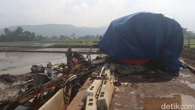 Bandung - Bangkai lokomotif yang ditutup dengan terpal berwarna biru menjadi saksi bisu kecelakaan kereta api maut yang melibatkan KA Turangga dan KA Lokal Bandung Raya.