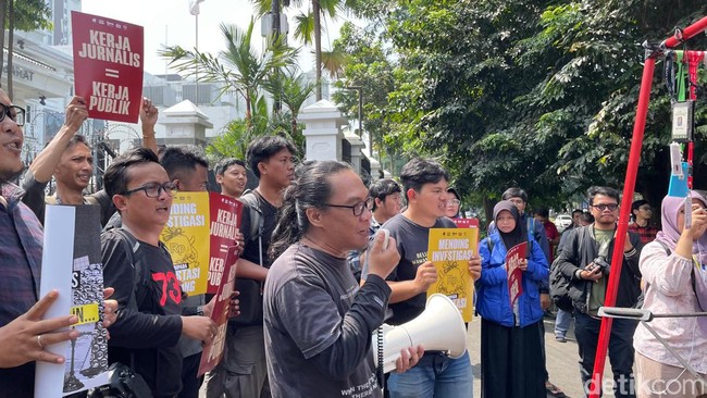 Bandung - Puluhan wartawan di Bandung unjuk rasa di depan Gedung DPRD Jawa Barat, Kota Bandung, Selasa (28/5/2024). Aksi ini bertujuan untuk memprotes UU Penyiaran.
