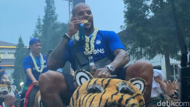 Bandung - Skuat Persib Bandung disambut dengan meriah di Gedung Sate. Di penghujung acara sejumlah pemain bahkan naik singa depok ke panggung utama.