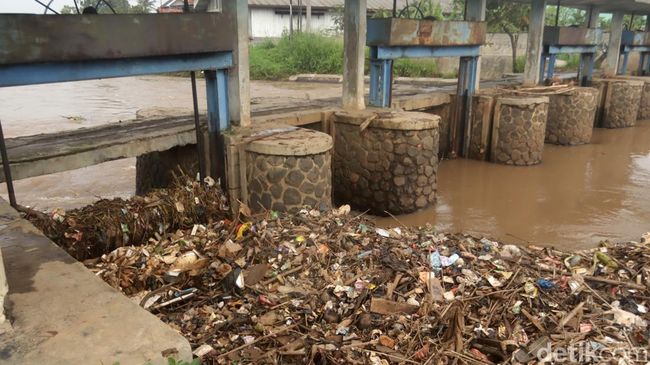 Bandung - Sampah menumpuk di Bendungan Sungai Citarik di Solokanjeruk, Kabupaten Bandung. Beragam sampah tertahan di sana dan nantinya akan bermuara ke Sungai Citarum.