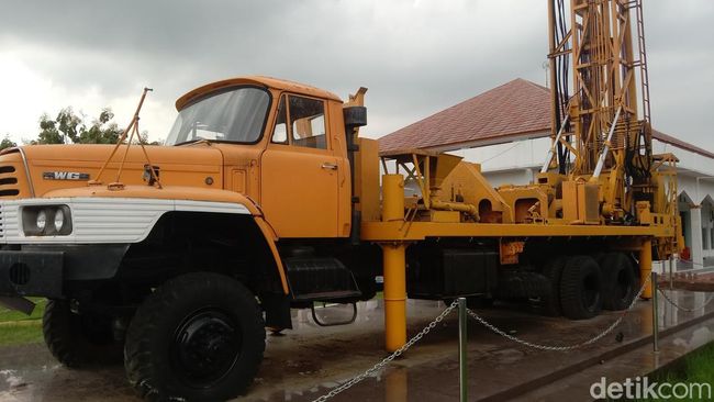 Indramayu - Mesin truk mounted tipe rig tone top dijadikan monumen dan menara di halaman Masjid Muhtadiin di Kecamatan Jatibarang, Kabupaten Indramayu.