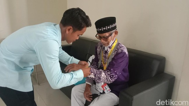 Indramayu - Calon jamaah haji Kloter pertama tiba di Embarkasi Kertajati di Desa Legok, Kecamatan Lohbener, Kabupaten Indramayu pada Kamis (1/5/2025).