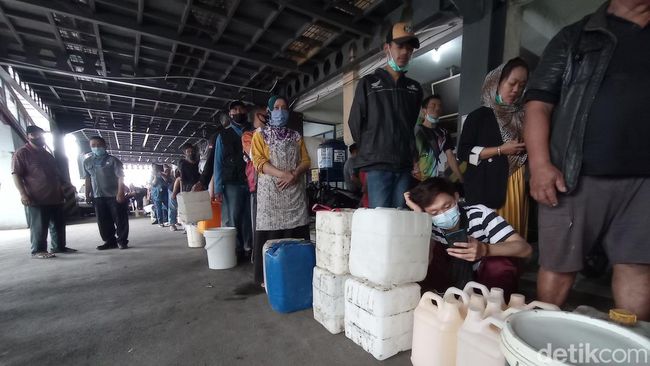 Pantauan detikJabar, pedagang dan masyarakat sekitar Pasar Sederhana menyerbu operasi pasar minyak goreng curah. Mereka membawa jeriken. Bahkan, beberapa di antaranya membawa ember besar.