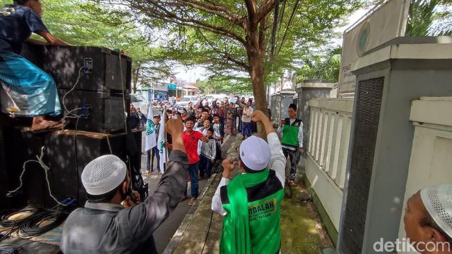 Terdakwa kasus dugaan penistaan agama M Kace kembali menjalani sidang pada Kamis (24/2/2022). Massa dari para santri dan ulama di Ciamis melakukan aksi di depan Pengadilan Negeri (PN) Ciamis.