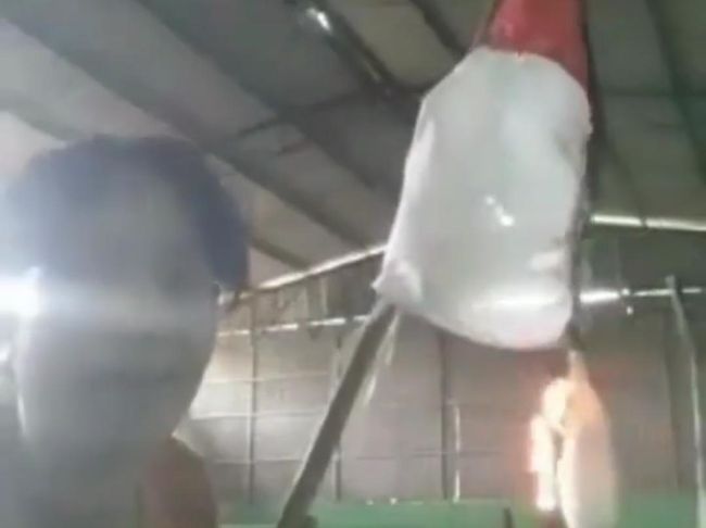 Tangannya membawa korek api gas. Dia terlihat seperti menyiramkan cairan ke kain merah-putih.
