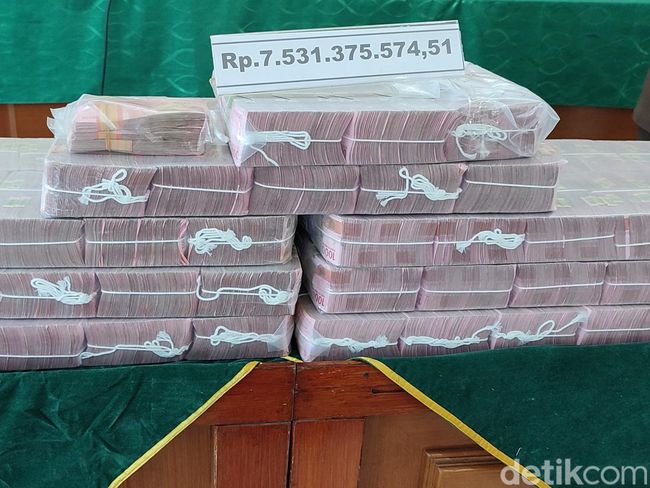 Tumpukan uang pecahan Rp 100 ribu itu menggunung di aula Kejari Bandung, Jalan Jakarta, Kota Bandung pada Rabu (13/4/2022). Uang tersebut diserahkan ke bank BUMN BRI dengan status penerimaan negara bukan pajak (PNBP). Total uang yang dirampas berjumlah Rp 7.531.375.574,51.