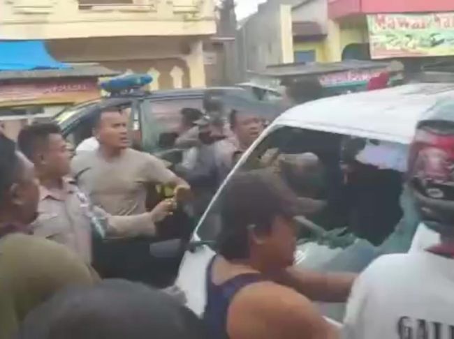 Bak film aksi, anggota ini menembakan senjata ke udara sambil meminta pengemudi berhenti. Hampir bersamaan, sejumlah warga melakukan perusakan kendaraan pikap.