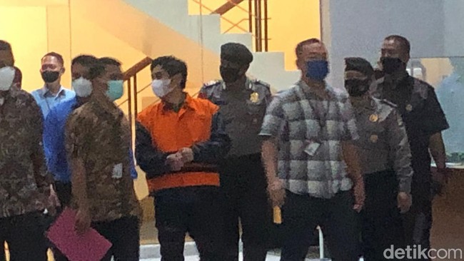 Usai menjalani pemeriksaan, pukul 21.27 WIB, Mardani turun dari ruangan dengan menggunakan rompi tahanan oranye. Tangan Mardani Maming terlihat diborgol.