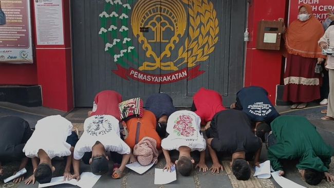 Masing-masing keluarga dan sanak saudara menunggu warga binaan yang akan keluar. Rasa syukur pun mereka panjatkan dengan melakukan sujud syukur di luar gerbang lapas.