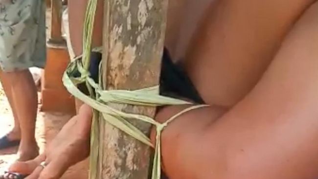 Dia hanya memakai celana jeans dengan kondisi tangan diikat ke tiang dengan seutas tali rafia. Pria itu tak berdaya.