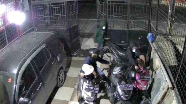 Gerombolan remaja terekam kamera CCTV saat mencuri sepeda motor di Deli Serdang, Sumatera Utara. Semua kendaraan roda dua itu digondol sekaligus oleh pelaku dalam hitungan menit.