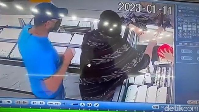 Modusnya, laki-laki yang memakai baju biru lalu berinteraksi dengan penjaga tersebut. Dari gelagatnya, pelaku mencoba mengalihkan perhatian penjaga itu dan beralasan akan memborong perhiasan.