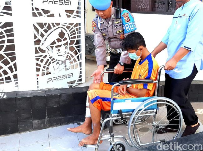 BY duduk di kursi roda sambil didorong oleh anggota Polres Karawang. Perban putih terlihat melilit di kaki kanan pria berusia 27 tahun itu.
