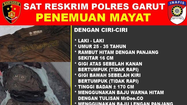 Selain itu, ada juga ciri-ciri lain yang ditemukan pada tubuh korban. Yakni kaus warna hitam dengan tulisan MrDee.CO, baju lengan panjang warna abu-abu dengan tulisan N/O, serta celana pendek warna abu-abu dengan merk Liquid.