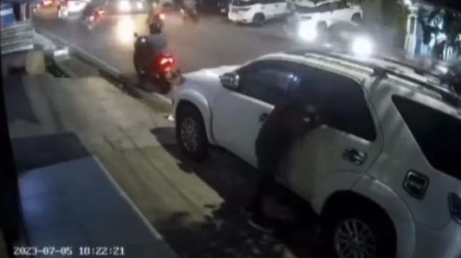 Kemudian, motor diparkir di depan mobil. Pria menggunakan topi dan masker mendekati mobil Toyota Fortuner berwarna putih yang terparkir di bahu jalan. Sesekali terduga pelaku melihat situasi sekitar.