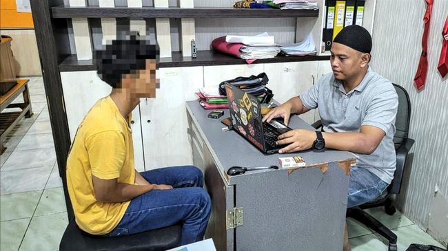 R (19) hanya bisa tertunduk lesu saat menjalani pemeriksaan penyidik Unit Perlindungan Perempuan dan Anak (PPA) Satreskrim Polres Sukabumi. Pria itu diketahui menganiaya kekasihnya yang masih berusia 15 tahun alias masih di bawah umur.