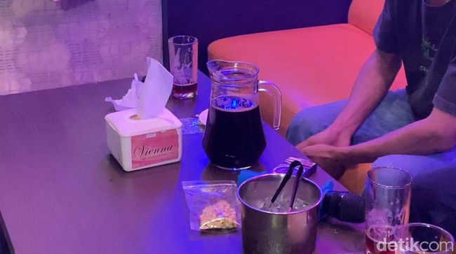 Di salah satu meja ruang karaoke, sekelompok pengunjung tampak berbincang sambil sesekali menenggak minuman dari sebuah pitcher besar di tengah meja. Dari kejauhan, minuman itu tampak seperti miniman teh biasa.