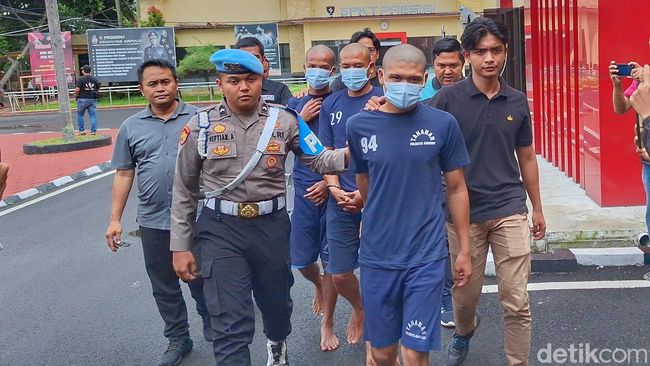 Nampak para pelaku mengenakan pakaian tahanan berwarna biru navy dengan borgol melingkar di tangannya. Mereka nampak tertunduk lesu saat digiring polisi.
