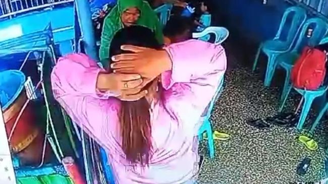 Dia terlihat sempat disapa oleh seorang pria yang tengah makan di meja dekatnya. Setelah situasi terpantau aman, T langsung menghampiri sebuah tas berwarna hitam yang tersimpan di sebuah kursi plastik berwarna hijau, mengambilnya, kemudian berlalu.
