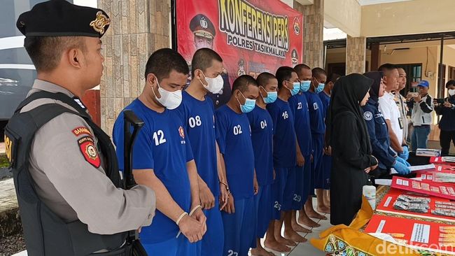 Dalam konferensi pers di Mapolres Tasikmalaya, Kamis (12/6/2025), sembilan orang tersangka bersama barang bukti dihadirkan. Kesembilan tersangka berinsial DR, UBK, YE, Ide, RH, MW, I, RF dan RM.
