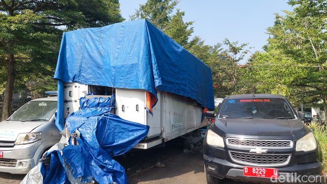 Jika terpal biru agak disibakkan, terlihat ada garis berwarna merah putih dengan tulisan 'Kejaksaan RI'. Di bagain bawah karavan itu ada tulisan 'Dinas Kesehatan Kabupaten Bandung Barat'.