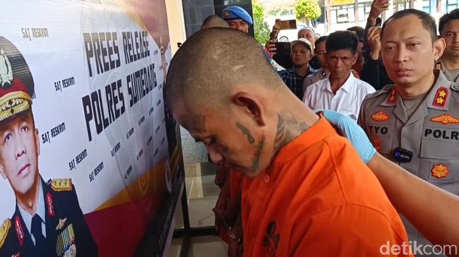 Pria bertato senjata di pipi itu jalan menunduk dengan pakaian serba oranye di Mapolres Sumedang pada Rabu (23/7/2025). Ijang ditampilkan bersama sejumlah pelaku kejahatan lainnya yang diciduk Satreskrim Polres Sumedang.