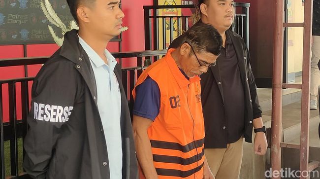 Udan Supena, Ketua Gapoktan di Kecamatan Cidaun Kabupaten Cianjur tertunduk lesu usai ditangkap polisi terkait dugaan korupsi traktor bantuan pemerintah.