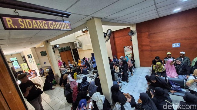 Pantauan detikJabar, kursi di ruang tunggu habis terisi, warga pun duduk di lantai hingga ke selasar pintu masuk gedung pengadilan.