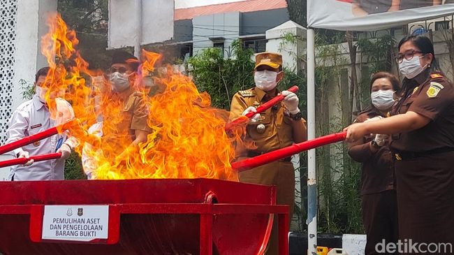 Barang yang dibakar seperti ganja sebanyak 144,6 gram, tembakau sintetis sebanyak 20 mililiter, hingga narkotika jenis sabu sebanyak 127,5 gram ludes dilalap si jago merah. Semuanya dimusnahkan di dalam wadah berupa tong besi.