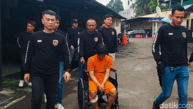 Wawan Sumpena terduduk di atas kursi roda gegara luka tembak di kaki sebelah kanannya. Dalam balutan baju tahanan, ia didorong menuju tempat konferensi pers di Mapolres Cimahi, Selasa (28/10/2025).