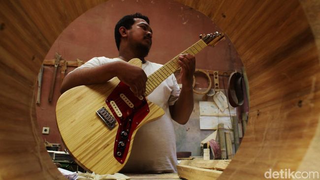 Setelah biola dirasa cukup, karya berikutnya adalah gitar. Alat musik ini umum dibuat dengan bahan kayu. Gitar ini pula-lah yang akhirnya dapat membawa produk bambu ini ke luar negeri.